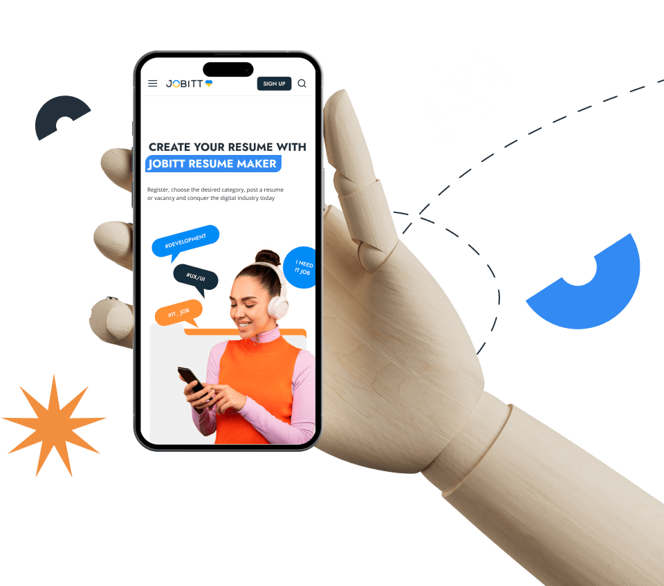 Using JOBITT, you can create a CV online for free and without registration and then publish it on the website or download it to your device. Our service allows you to create a CV according to a template and highlight your portfolio against the background of other candidates, thanks to thoughtful design and content.